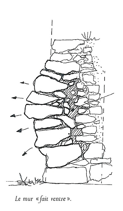 Concernant les murs de soutènement, l'espace situé entre la face interne du mur et le massif de terre est comblé avec de la pierraille servant de drain. Il s'agit en effet d'éviter que l'eau ne stagne derrière le parement du mur, provoquant son gonflement (« le mur fait le ventre ») et à terme son éboulement.